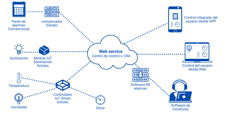 - Se instala un Web service en el centro de monitoreo de alarmas o en el servidor en la nube destinado para ello. Este Web service se encarga de administrar las señales IoT, la conexión con la Aplicación móvil y la conexión Web del usuario.