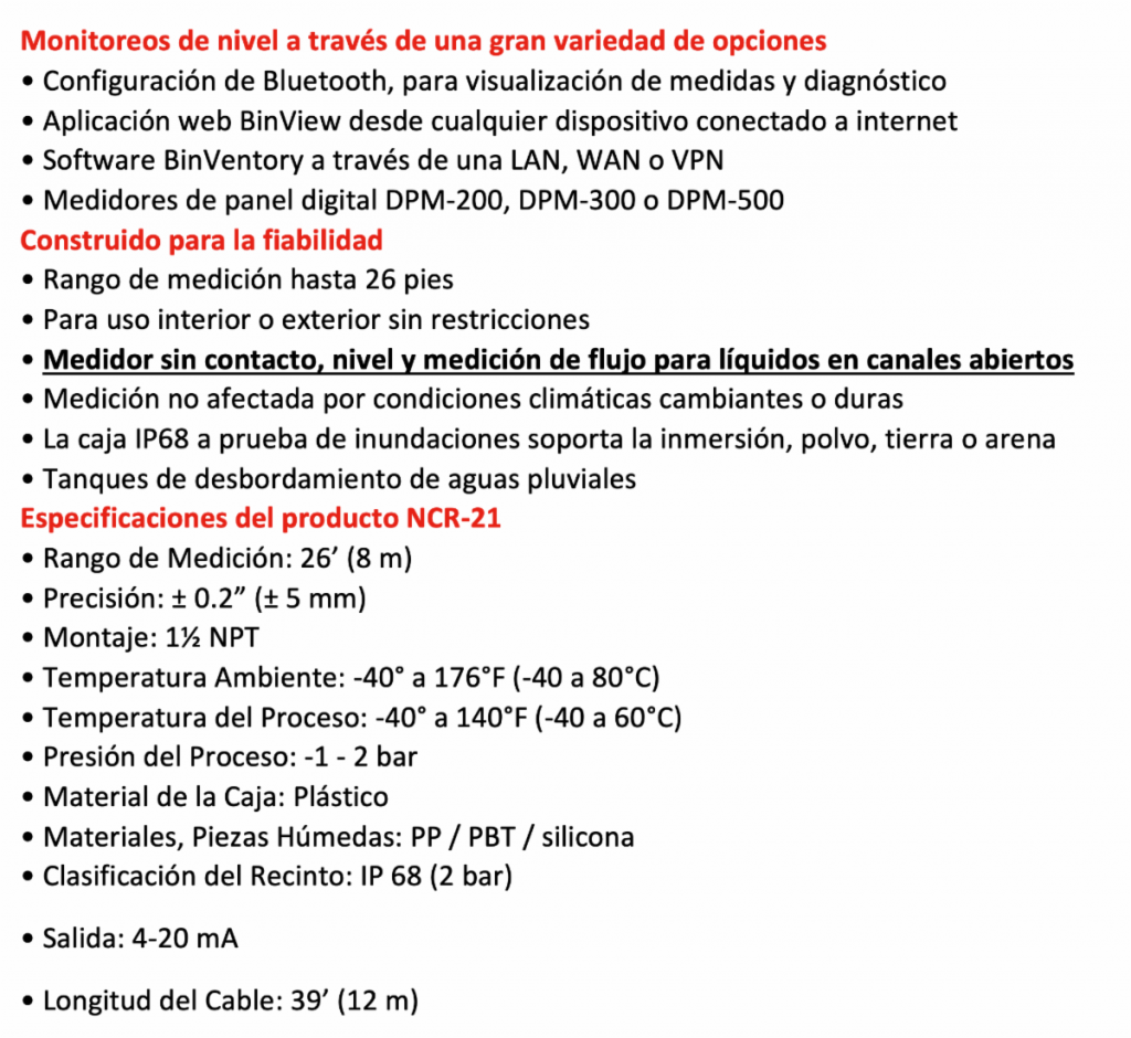 El NCR-21 es un sensor sin contacto de bajo costo de medición de líquidos como agua, aguas residuales y otros líquidos almacenados en pequeños contenedores de hasta 8 m. Ideal para estaciones de bombeo y monitoreo de desbordamiento, también es adecuado para medir varias grasas, amoniacos líquidos y otros aditivos alimentarios, su cobertura IP 68 a prueba de inundaciones garantiza un funcionamiento continuo sin mantenimiento, es fácil de configurar y monitorear utilizando el bluetooth integrado para comunicación inalámbrica con acceso a datos a través de un teléfono inteligente, tableta o PC. El NCR-21 también es compatible con cualquiera de las opciones de aplicaciones web BinView® o software Binventory® para monitorizar niveles desde múltiples tipos de sensores o sitios.