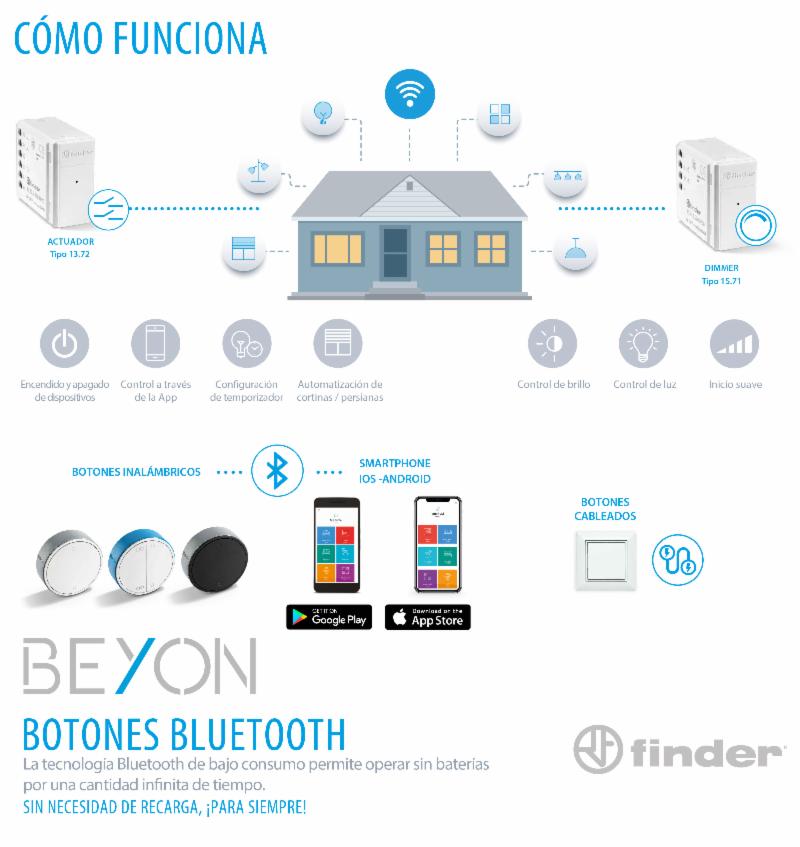 BEYON es un pulsador inalámbrico que no necesita batería, ni debe recargarse nunca. Con él podrás encender y apagar luces, subir o bajar las persianas y activar ESCENARIOS personalizados para cada momento.